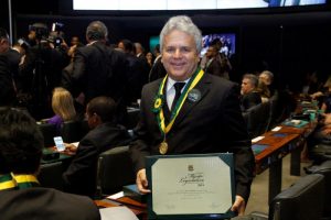Der Direktor Luis Carlos Marques Fonseca erhält eine Medaille und Diplom als Anerkennung.