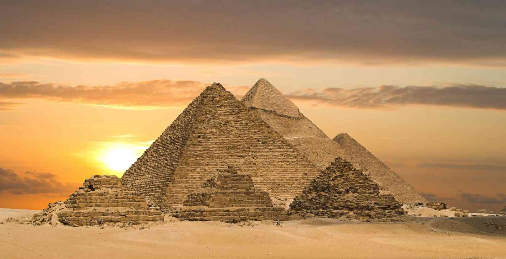 Die Pyramiden von Gizeh, von Süden gesehen; im Vordergrund die drei kleinen Königinnenpyramiden, dahinter die Pyramide des Mykerinos, in der Mitte die Chephren und rechts die des Cheops ("Große Pyramide)