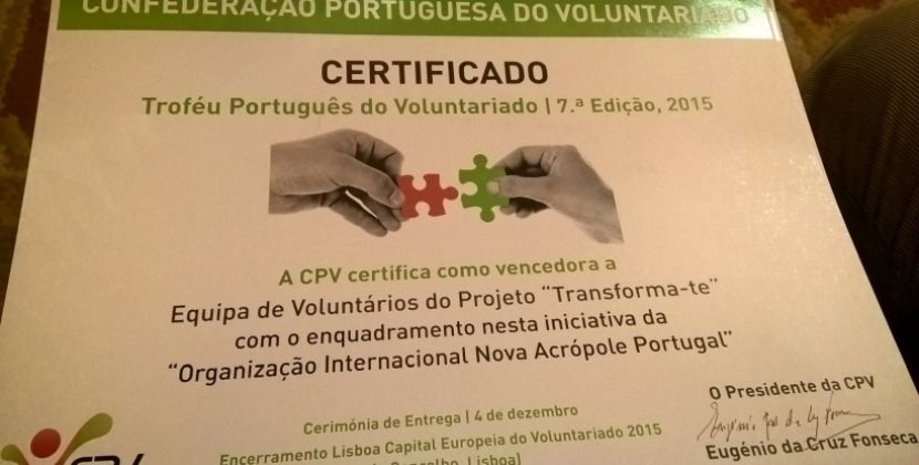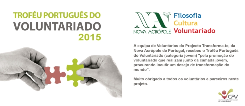 Am 4. Dezember wurde an Neue Akropolis Portugal der Preis für Ehrenamtliche Tätigkeit 2015 in der Kategorie Jugend verliehen, und zwar für das Ausbildungsprogramm 'Verändere (dich)' ('Transforma(te)') für junge Menschen.